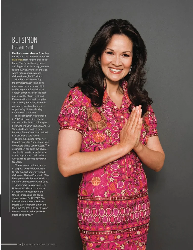 Malibu is a world away from her native land, but that hasn’t stopped Bui Simon from helping those back at home. The former beauty queen and Pepperdine University graduate runs the Angels Wings Foundation, which helps underprivileged children throughout Thailand.